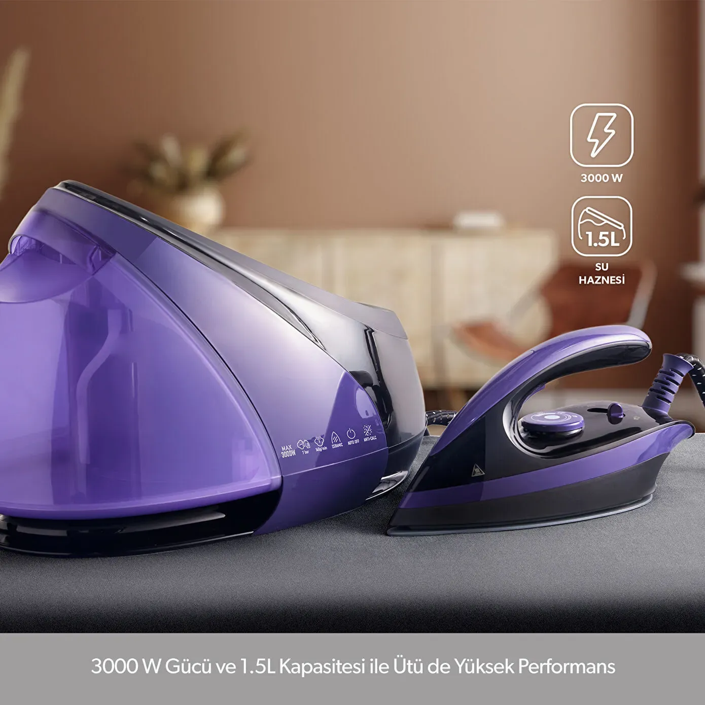 - 3000 W gücü ile ütüde yüksek performans.