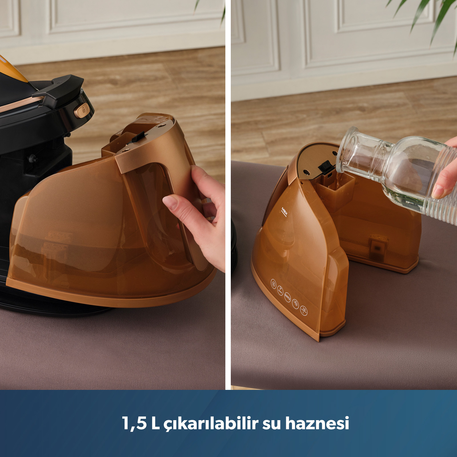 2)Su deposu ütü çalışırken doldurulabilir mi? Evet, 1.5 litrelik su deposu çıkarılabilir yapıda olduğu için ütüleme işlemini yarıda kesmeden hazneyi kolayca doldurup kullanıma devam edebilirsiniz.