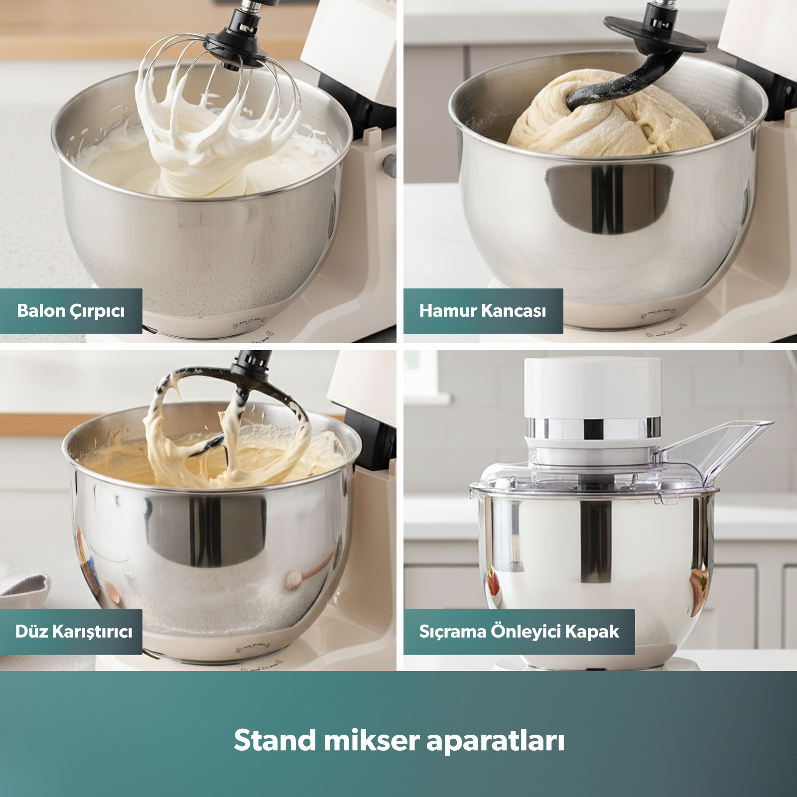 - 3 Farklı Karıştırma Aparatı (Çırpıcı, Karıştırma ve Yoğurucu)